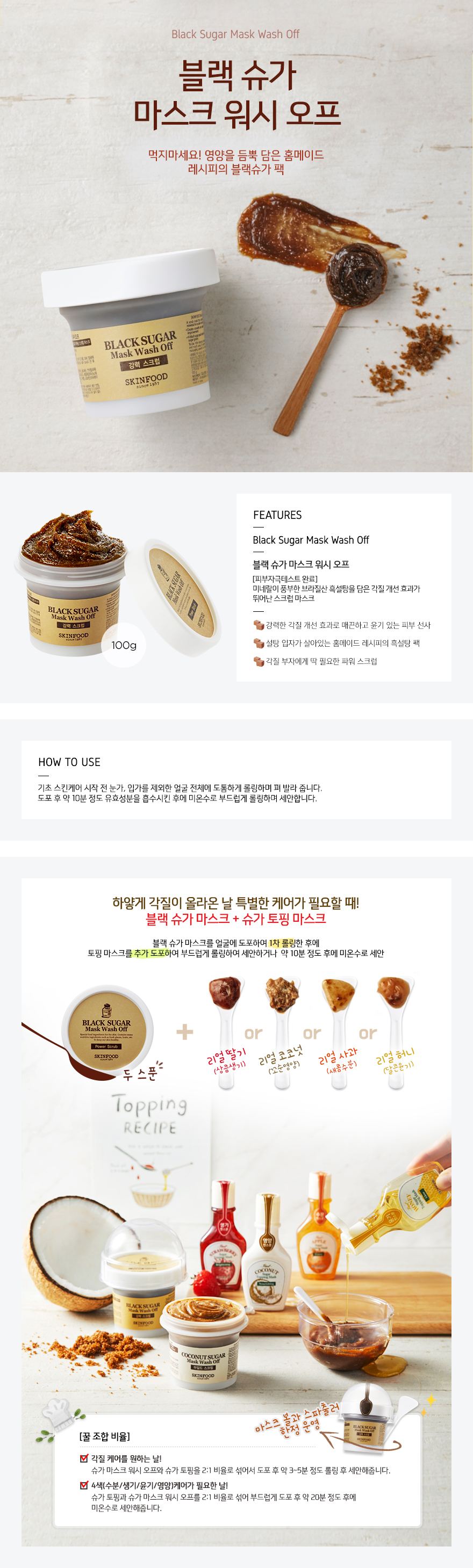 Mặt nạ đường đen Skinfood (Black sugar mask wash off Skinfood): Mặt nạ đường đen chiết xuất từ đường đen Brazil có tác dụng loại bỏ tế bào chết trên da, kiềm dầu, trị mụn đầu đen, giúp da mặt láng mịn, đồng thời cung cấp vitamin và khoáng chất cho bạn làn da khỏe mạnh.